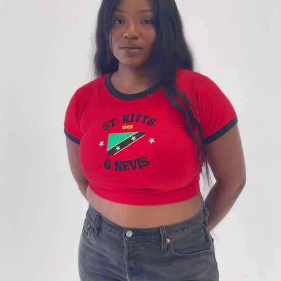 This St Kitts and Nevis Crop Top is a stylish addition to your wardrobe, featuring an embroidered St Kitts and Nevis flag and year of independence on the front.