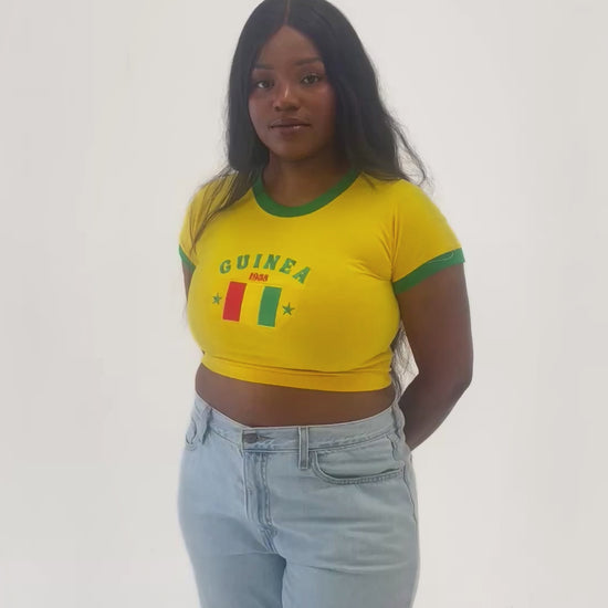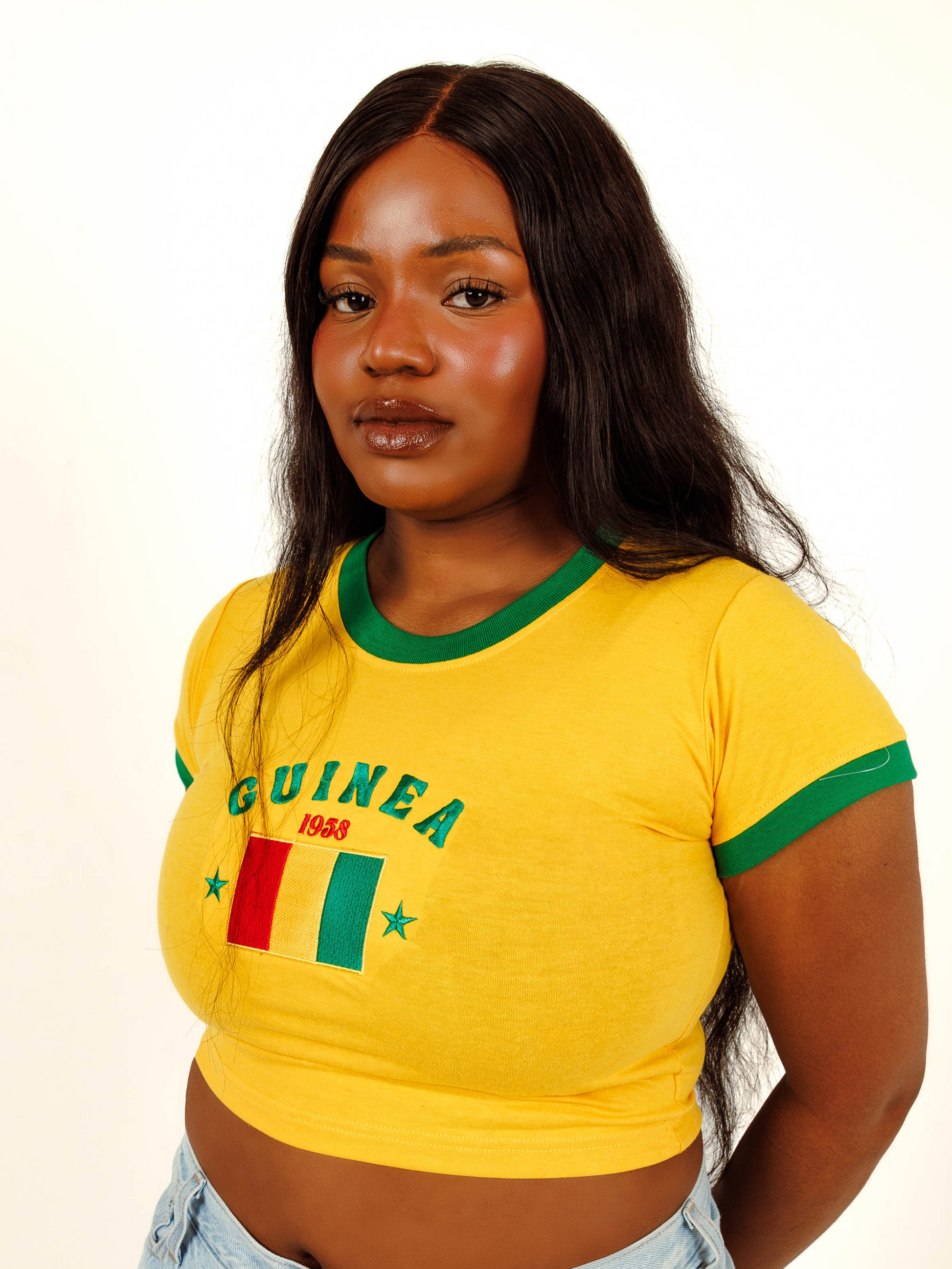 This Guinea Crop Top is a stylish addition to your wardrobe, featuring an embroidered Guinea flag and year of independence on the front.