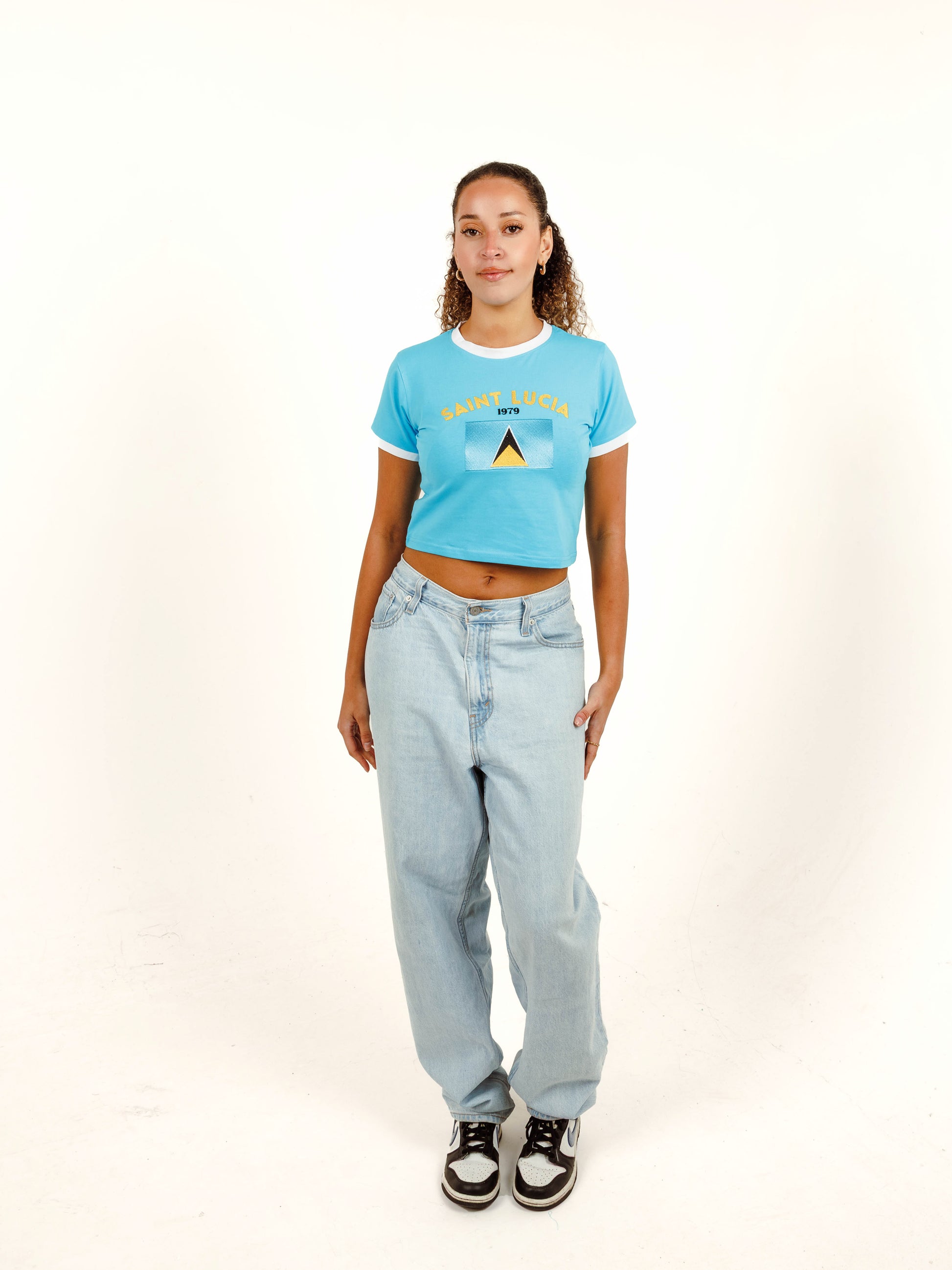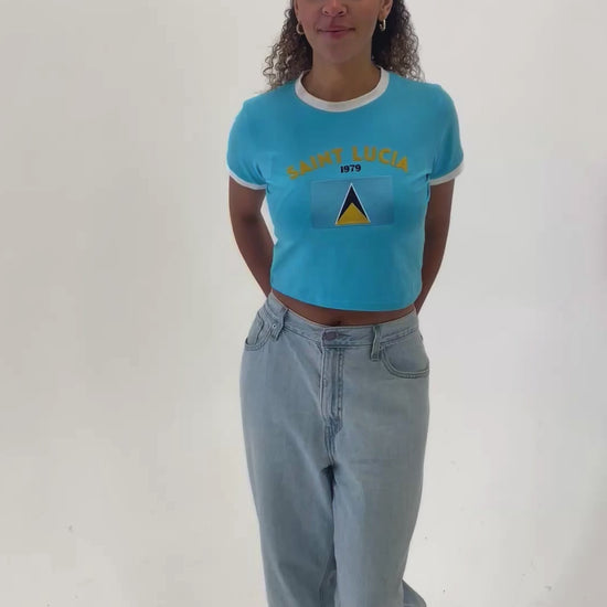 This Saint Lucia Crop Top is a stylish addition to your wardrobe, featuring an embroidered Saint Lucia flag and year of independence on the front.
